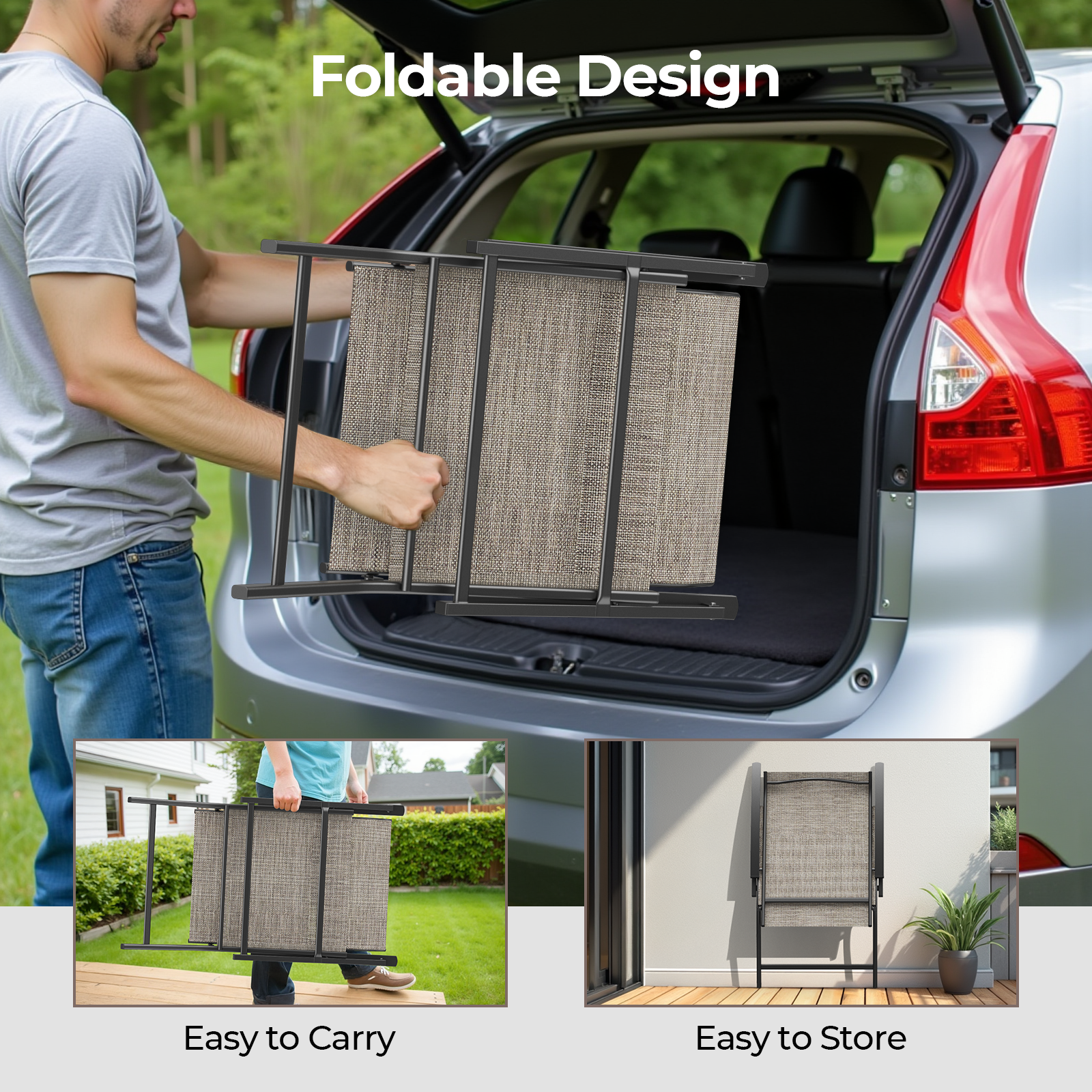 Material: Steel, Textilene, Tempered Glass
