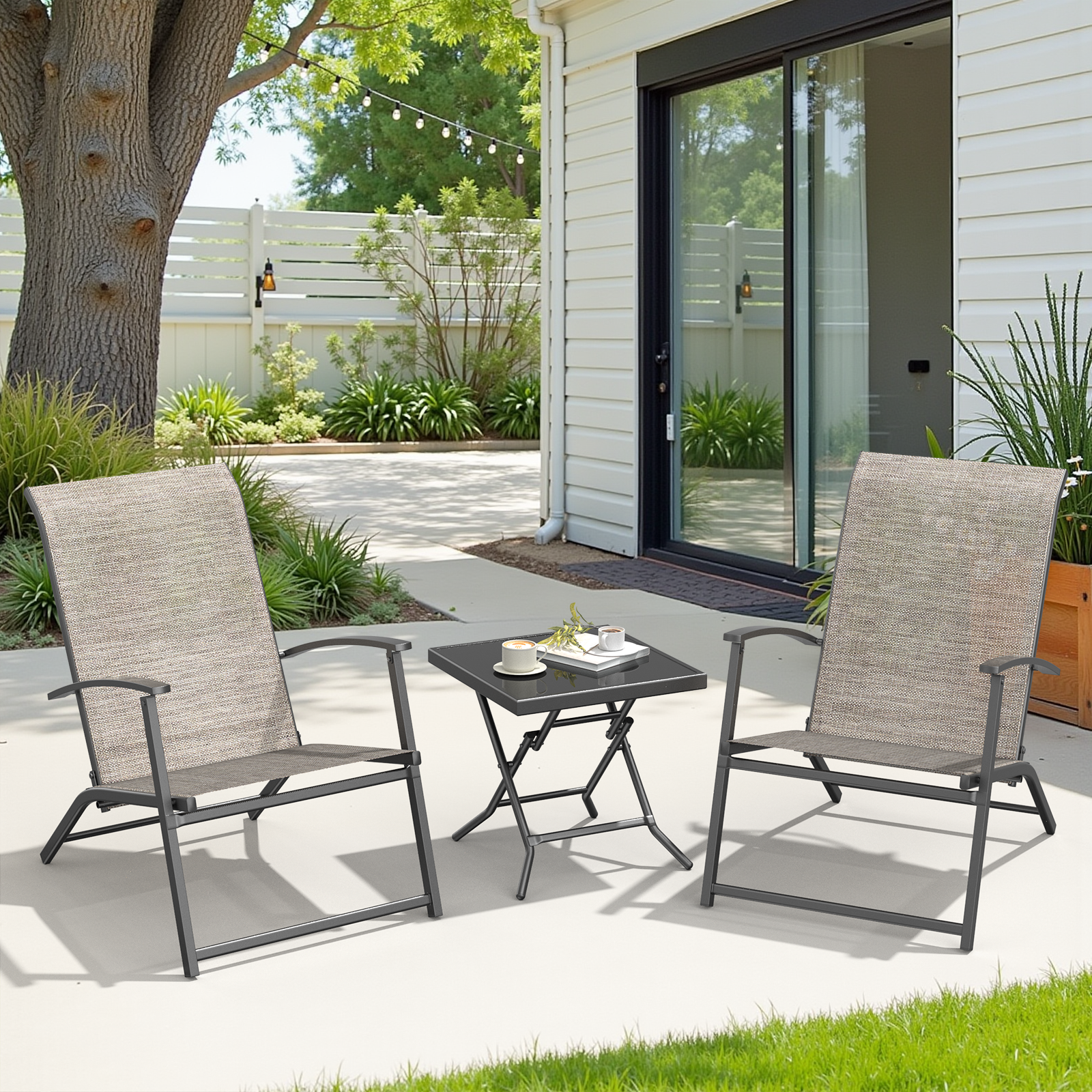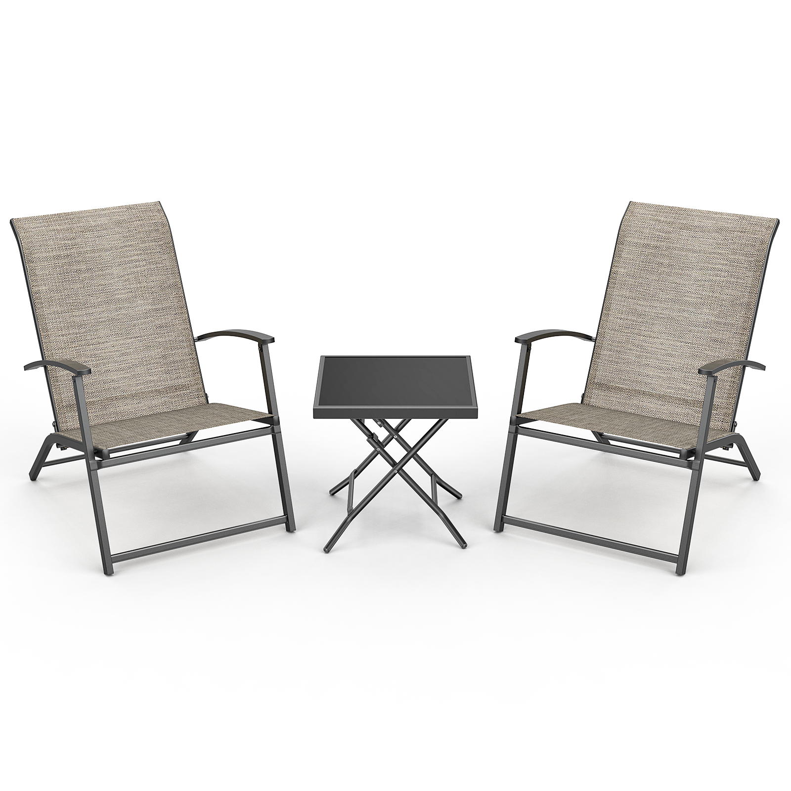 Package Includes: 2 x Textilene Adirondack Chairs, 1 x Side Table